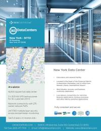 365 Data Centers' NY10 New York City, located at 65 Broadway, offers a strategic edge with its downtown Manhattan location, providing businesses with advanced colocation, network services, and low-latency connectivity ideal for financial services and other critical applications. This facility ensures high performance, reliability, and security for your IT infrastructure needs.